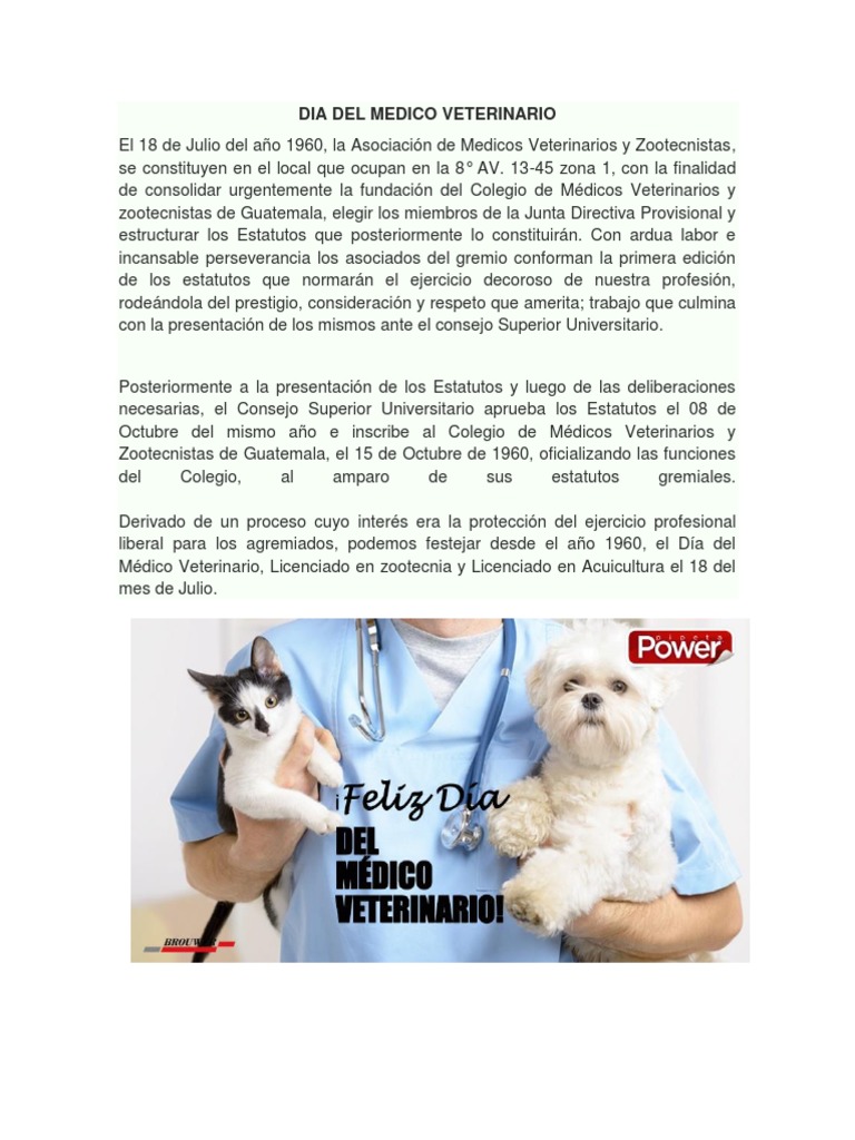 Avenida de la zona 1, el 18 de julio de 1960. El 18 de julio se celebra la fundación del colegio profesional de médicos veterinarios de guatemala ⚕ y también del zootécnista ⚕️, ellos siempre velan por el. Pancho cavero celebra el día mundial del veterinario en porque hoy es sábado con andrés. ¿cuál es el origen del día del maestro en guatemala? En 2004 por la experta en estilo de vida familiar y de mascotas y defensora del rescate de animales colleen paige. Sin imparcialidad judicial no puede haber juicio justo. El 18 de julio se celebra el día del veterinario en guatemala. 34.911 me gusta · 580 personas están hablando de esto · 233 personas estuvieron aquí. Cuentan con muchos servicios como la anestesia inhalada, ultrasonografía, rayos x digital, limpieza dental, monitoreo cardiovascular y más. Que sea un médico veterinario que cubra emergencias en cualquier horario del día. Desde el 6 de agosto del año 1959, se celebra el día del ingeniero agrónomo y del médico veterinario, en conmemoración a que en esa fecha pero en 1883 se dictó por primera vez en la argentina la carrera de agronomía en la escuela agrotécnica y veterinaria santa catalina. Estamos disponibles cuando su mascota más lo necesita. Por ello es imprescindible conocer.